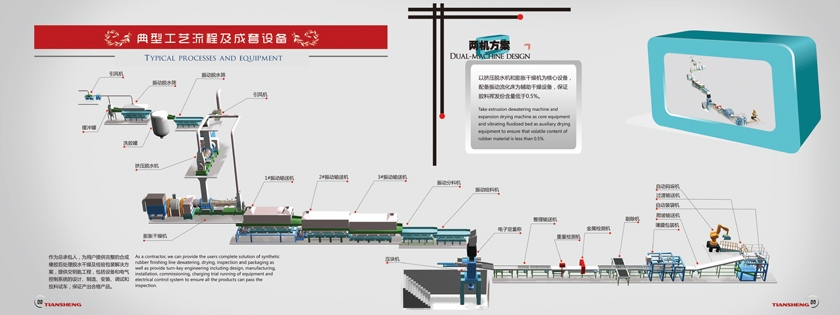 以挤压脱水机和膨胀干燥机为核心设备,配备振动流化床为辅助干燥设备,保证胶料挥发份含量低于0.5%。